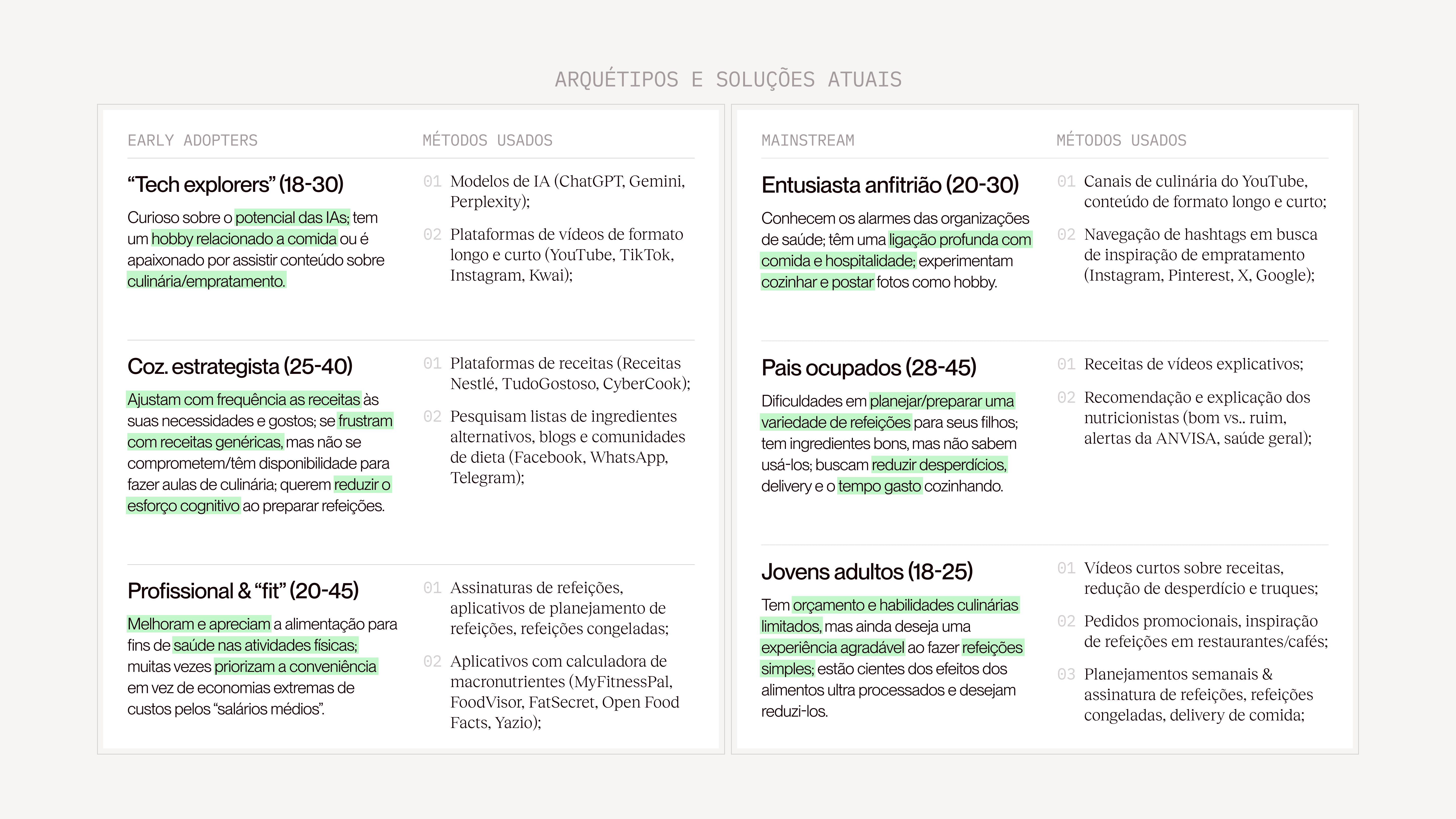 Estruturei as principais interações do aplicativo para dois potenciais perfis de usuários: ‘exploradores de receitas’ e ‘customizadores perfeccionistas’.