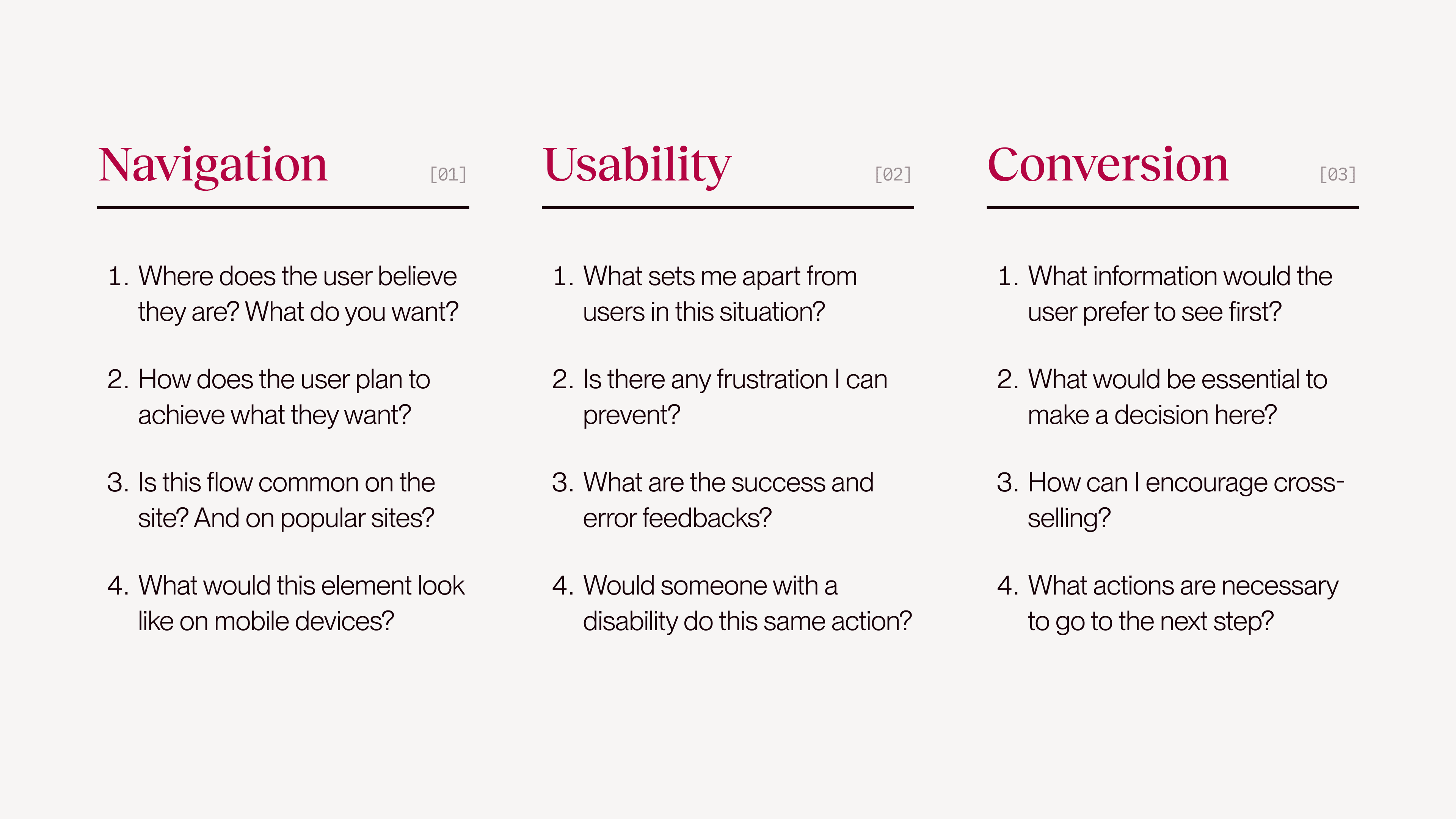 To maintain a clear direction on wireframing the customer journey, we had to stick to three crucial factors: navigation, usability, and conversion.