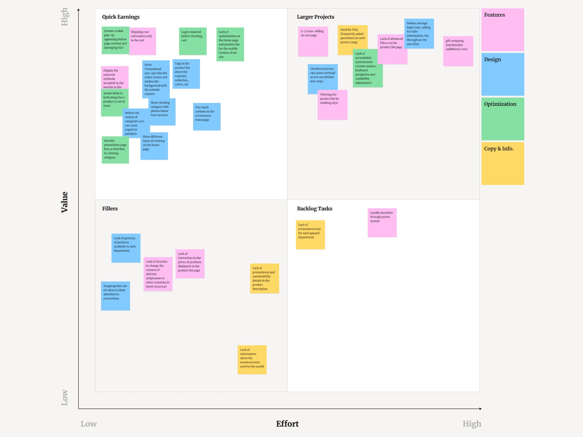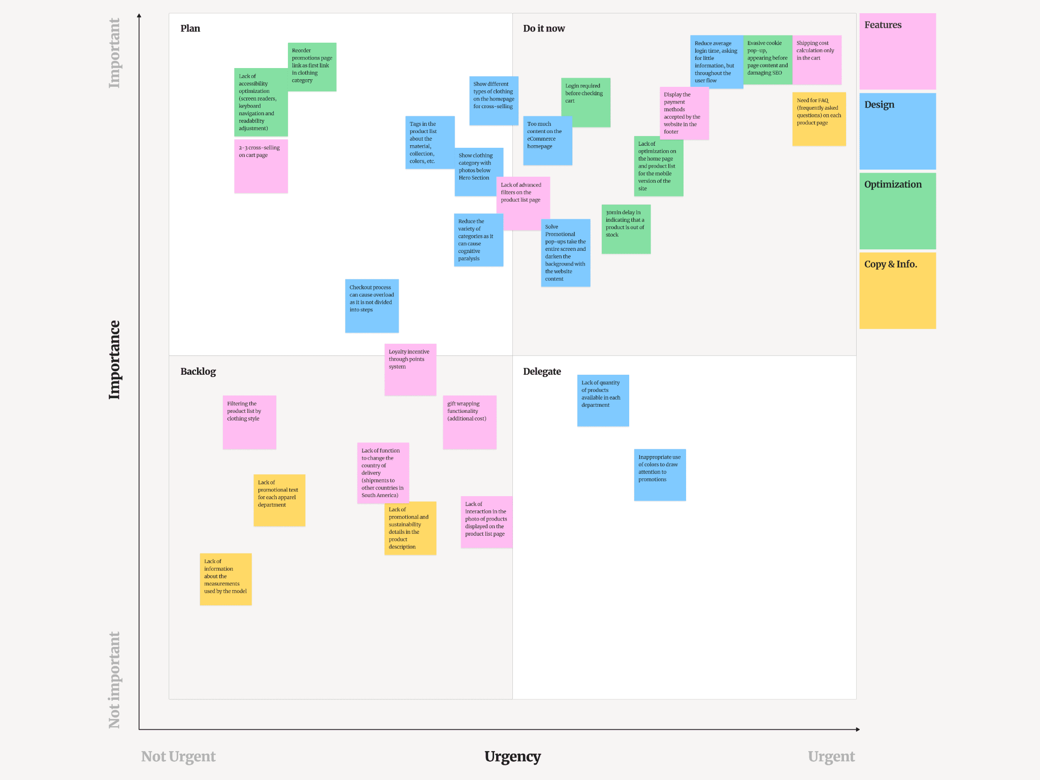 Then, I delivered my insights to stakeholders to consider their feasibility and prioritize the outstanding ones based on Effort x Value and, to sort the backlog, Importance x Urgency matrix.